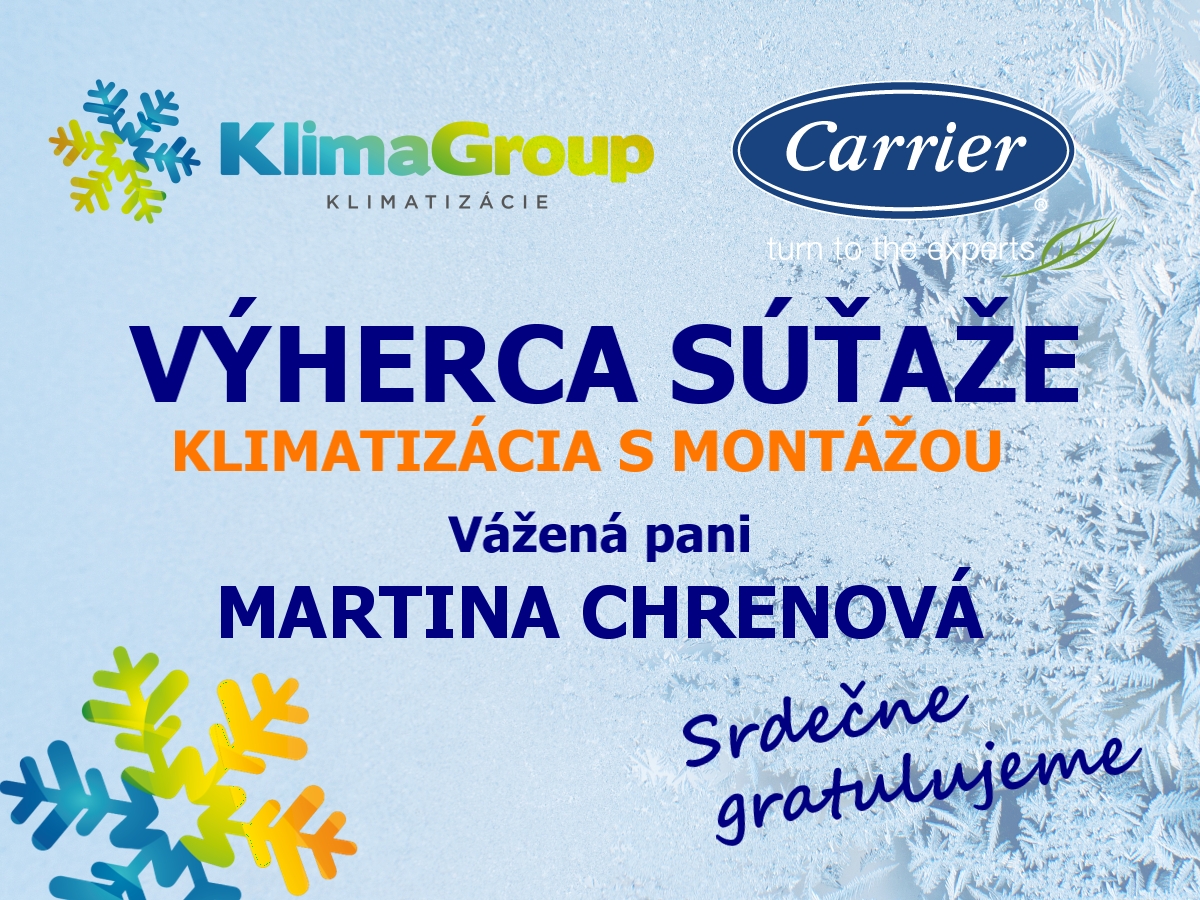 Ak ste členom našej KLIMA group rodiny na facebooku, potom viete, že spoločnosť pre Vás pravidelne pripravuje rôzne zaujímavé súťaže. Do súťaže o klimatizačnú jednotku spolu s montážou sa zapojilo viac ako 1000 fanúšikov a tento krát sa šťastie usmialo na slečnu Martinu Chrenovú. Srdečne gratulujeme k výhre a Vy ostatní nezúfajte, už teraz prebieha ďalšia zaujímavá súťaž do ktorej sa môžete zapojiť.